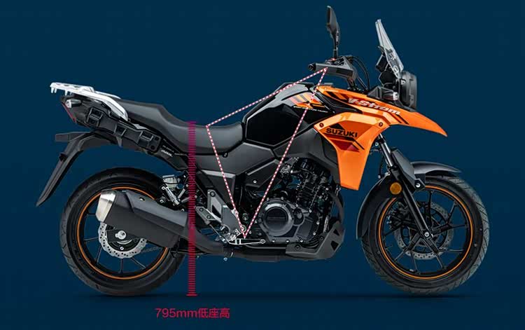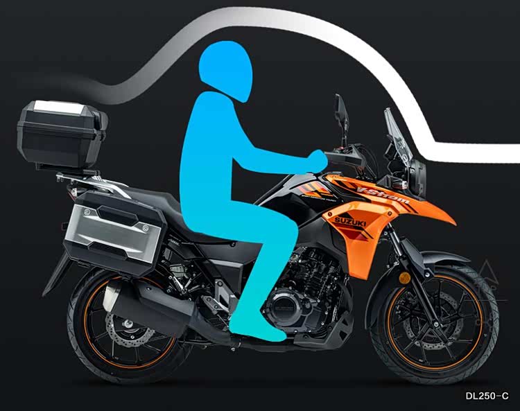 DL250的座高为795mm,采用加大手把与座垫高度差的设计,骑行时手臂轻松,腰背舒坦;适度收窄的座垫前部宽度,大大改善了脚掌的着地性,还可根据个人使用习惯选择踩挡或跳挡。DL250配置的专业前风挡优化控制气流,通过较小的迎风面降低风阻,有效减轻了迎面风对骑士身体的冲击。