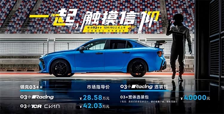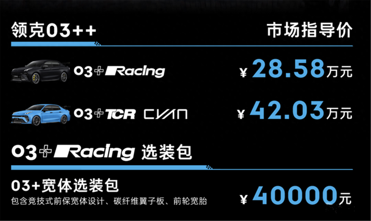 领克03++目前一共两个版本,分为四驱版本的市场指导价28.58万元的03+Racing和两驱版本的市场指导价42.03万元的03+TCR。其中03+Racing还有市场指导价40000元的宽体选装包。