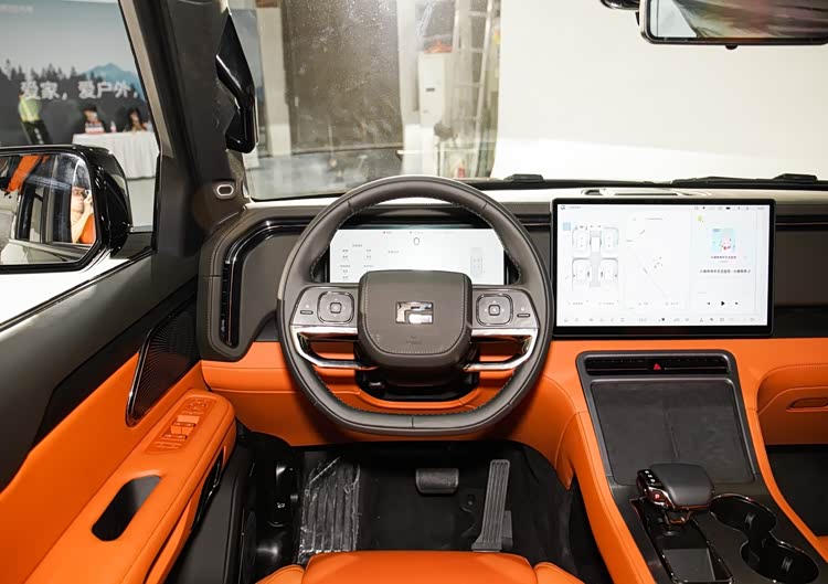 进入车内,新车黑棕双色拼接的造型设计让新车的豪华氛围更加浓郁,而且液晶仪表以及悬浮式中控大屏都是提升着新车的科技氛围,双幅式的多功能方向盘结合镀铬饰条的装饰看起来更加个性,而且低矮的电子档把结合第二排头部的吸顶电视也是更加的具有档次感。
