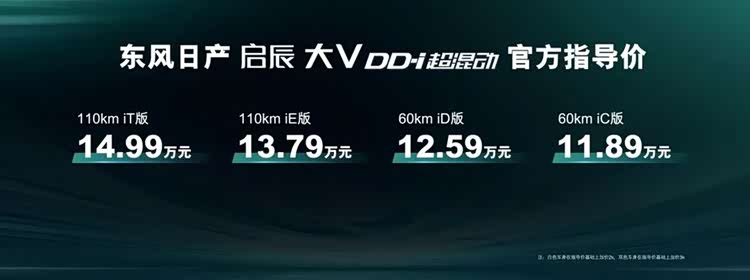 作为汽车价格普遍下探时期的产物,启辰大VDD-i插混在定价之初便拿出了充足的诚意,11.89万元-14.99万元的售价区间,无论是对比合资企业,还是自主品牌,都算得上性价比之选。
