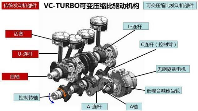 可变压缩比,利用创新可变多连杆系统,内燃机压缩比在8:1(高性能)-14:1(高效能)间实时智能无级切换,当车速不高时,我们主要考虑的是燃油经济性,此时压缩比调高,从而降低油耗;当车速高或者需要加速时,压缩比调低,从而提升车辆性能。在调节过程中,主要调节的是活塞的止点位置,从而改变燃烧室空间,对于一款家用车来说,全新天籁做到了对性能和经济的全面考虑。
