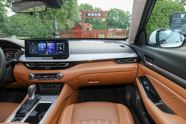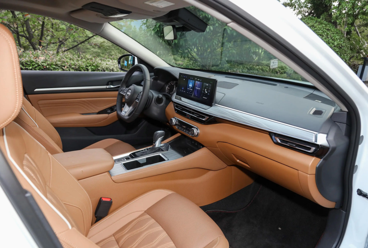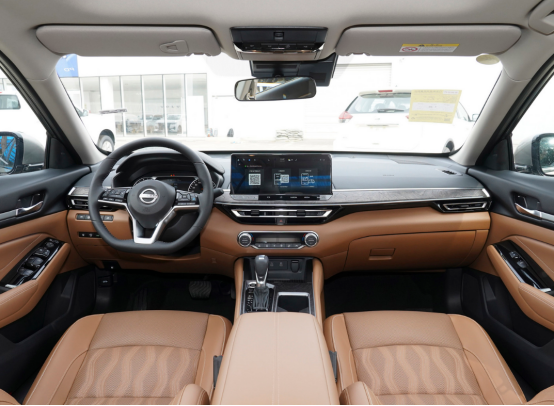 全新天籁的内饰做了一定的优化调整,尤其是中控台位置,老款车型在中控屏位置向下有一个曲折的走势,而全新天籁则是采用了比较平直的结构,将中控台分成上下两大部分,中间则是镶嵌了一条贯穿式的木纹饰板,并且经过银色镀铬饰条环绕一周,而全新升级的12.3英寸中控屏正好位于木纹饰板的上方,下方是梯形的空调出风口以及传统风格的空调控制旋钮,虽然很多新车都移除了这些物理按键,但是对于一部分车主来说,并不喜欢通过语音和触控屏操控空调,所以这些物理按键依然有存在的必要。
