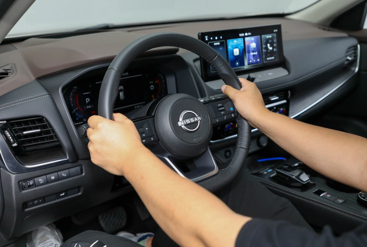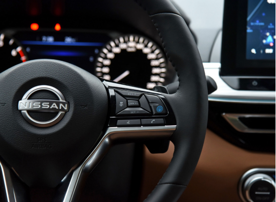 方向盘结构为D字形三幅式设计,左右两个辐条安装了大量的按键,包含多媒体控制、导航系统等功能,如果你在方向盘右半部分发现了一个蓝色图标,造型为两个圈和一个小车,那么这款车就是搭载了超变擎系统的全新天籁。