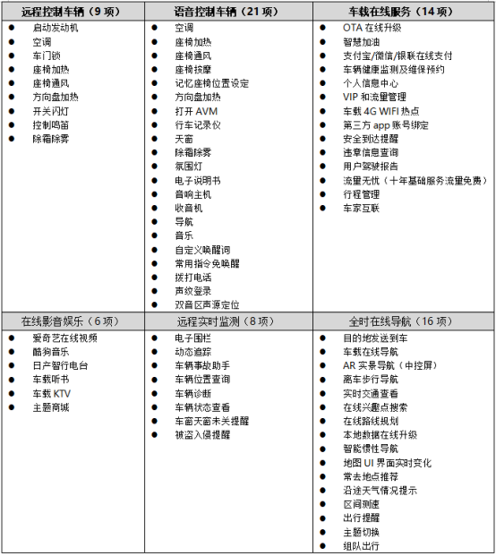 我们可以对六大板块做一个简要概述,远程控制主要为了在冷热天气下,提前调节车辆空调和座椅功能,提升驾驶的品质;语音控制车辆主要为了提升用车的便捷性和安全性;车载在线服务实现了在线支付、车家互联和其他信息的同步;在线影音娱乐提升了外出的愉悦心情;远程实时检测主要是为了车辆的财产安全和健康;全时在线导航为用户提供了更为便捷的出行服务。
