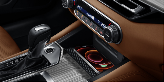 另外在空调控制区域下方,还有一个向内倾斜的凹陷空间,这里是放手机的位置,底部采用了防滑材质,支持15W手机无线充电,可以让手机时刻保持满电状态,也不用再插数据线了,毕竟车厢内越简洁越安全。