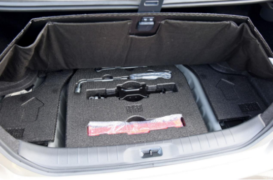 在行李舱盖板下方,是备胎和工具盒,两侧要给底盘留有空间,所以中间的备胎以下沉区域下沉结构设计,正好放下备胎,上方还有一个隔离板,带有一些卡槽,放置着扳子、千斤顶、三脚架等应急物品。在上面还有两层盖板,不仅比较结实、平整,还能放置下方的物品发生震动和异响。