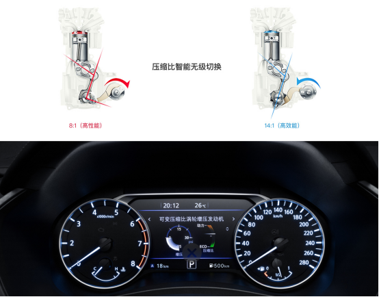 VC-Turbo 超变擎 可变压缩比涡轮增压发动机凝聚了日产内燃机团队20年的科研智慧,攻克了遗留130多年的课题,荣获了2019年“中国心”十佳发动机和2019&2020沃德全球十佳发动机等多个奖项。VC-Turbo超变擎独创多连杆系统,颠覆传统发动机的曲柄连杆结构,实现发动机压缩比在8:1(高性能)-14:1(高效能)之间的智能无级切换,融合多连杆、双燃烧循环、双燃油喷射、单涡流涡轮增压技术、镜面溶射缸孔技术、集成式排气歧管、多路径水冷控制阀、可变排量机油泵共8大前瞻性制造技术于一身,强劲动力与低油耗实现更好的平衡。