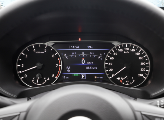 全新天籁的液晶仪表盘有两种尺寸,入门款为5英寸,其余四款车型为7英寸,两者在样式上比较相似,只是中间的液晶屏幕大小不同,大尺寸的显示的更加清晰,便于观察。这种炮筒形表盘符合我们对燃油车的认知,不仅能够更加直观的看到发动机转速和车辆行驶速度,还充满了运动气息。中间的液晶屏主要显示车辆的动态信息和功能配置,我们通过方向盘和中控台上的按键操控更改车辆功能时,可在液晶仪表盘上查看具体信息。除此之外还能展示多媒体信息。