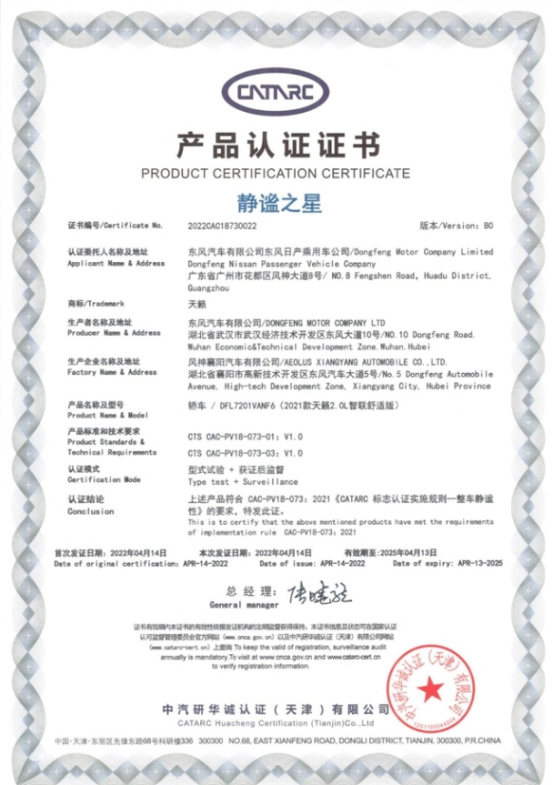 面对事业和生活的双重压力,每个人都在人生的旅途之中奔波,想要的得到一个安静的时空,用来短时间逃避生活的繁琐,让心灵得到洗涤,是一件多么不容易的事啊,而全新天籁给了我们这样一个机会,在2021年,全新天籁在中国量产车性能大赛CCPC专业站隔音降噪赛上,力压宝马、奔驰、沃尔沃等众多豪华车型,夺得全场“静谧之王”。在2022年世界噪音日前夕,全新天籁凭借同级领先的静谧性,荣膺权威机构中汽研华诚认证中心颁发的认证证书,在多项整车静谧性测试中以超越国家标准表现获评“静谧之星”称号,作为首款获得该称号的合资B级车,全新天籁实至名归。