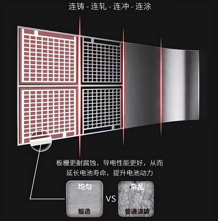 当然除了结构之外,板栅本身的材质也很关键,普通电瓶一般用传统的铅锑合金、铅钙合金。而不少高端电瓶往往会选择耐腐蚀寿命更长的三元合金。比如铅钙锌合金、铅钙锡合金。冠军蓄电池用的就是后者。而且在铅钙锡合金基础上添加了纳米级的炭。大大改善导电性能,赋予电瓶连续释放大电流的能力。