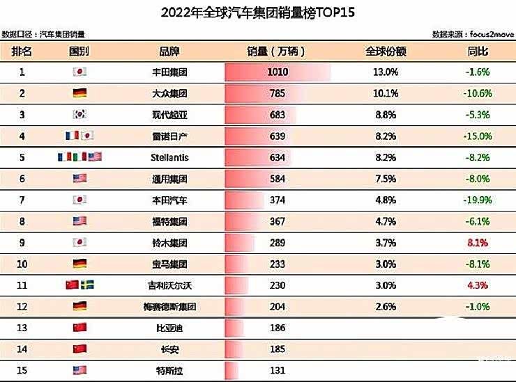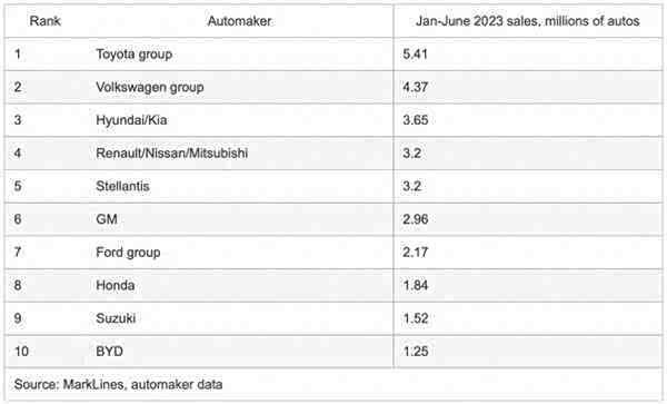 以今年上半年的情况为例:丰田还是全球最畅销的汽车品牌,541万台的总成绩,甩开第二名的大众近100万台的差距。现代起亚、雷诺-日产-三菱、Stellantis、通用集团、福特、本田、铃木分列三到九,比亚迪以126万台的成绩,首次进入“全球前十大车企”序列,距离丰田的差距是415万台。