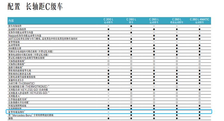 此次2024款奔驰C级部分车型涨价主要是增加了个别配置。根据梅赛德斯-奔驰官方公布的信息显示,C 260 L系列车型现已默认标配豪华环境氛围灯,该项配置此前的选装价格为2500元。至于其余功能配置则没有变化,前/后排座椅加热、前排空调座椅、平视显示、预防性安全系统(PRE-SAFE)、ETC读卡器等配置将继续以选装的形式供应。