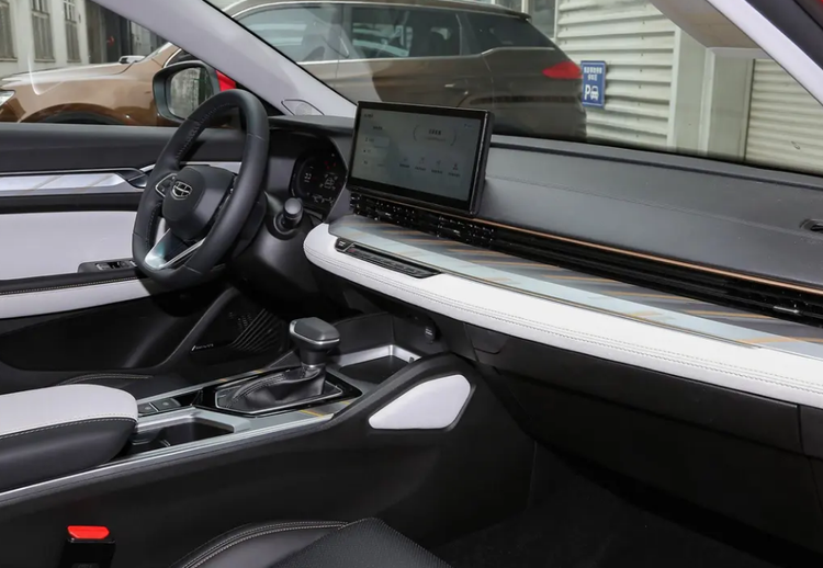 帝豪L的丰富配置也是其卖点之一。它配备了全景影像、无钥匙进入、底盘透视、L2级辅助系统等多项功能。中控屏和液晶仪表均为12.3英寸,搭载了最新的银河OS生态系统,支持语音指令、手机远程操作和各种家用APP,还可以进行FOTA在线升级,整体功能非常强大。关键是它的用料非常到位,中控台和车门处都采用了软包面料,质感突出。此外,帝豪L还采用了双拼色的配色方案,内饰时尚感特别突出。