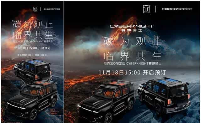 11月17日,由坦克品牌与CYBERSPACE(超境)共创的全新量产车型CYBERKNIGHT赛博骑士亮相,11月18日下午3点开启预订。限量7000台,首批预售5000台,其中耀斑橙3500台,脉冲蓝3500台。官方暂未公布售价,根据官方公布的产品核心卖点,以及官方视频中展露的碳纤维使用范围,预测定价35万元左右。