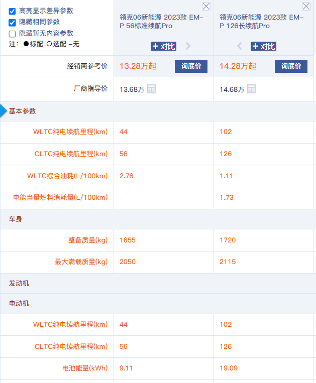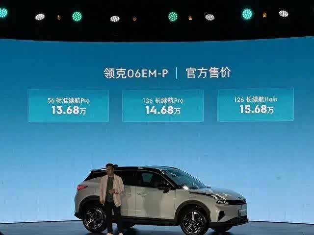 根据领克官方的消息,领克06 EM-P售价在13.68万到15.68万元,共三款车型,分为两个版本的纯电续航,CLTC工况下的纯电续航里程分别为56km和126km。