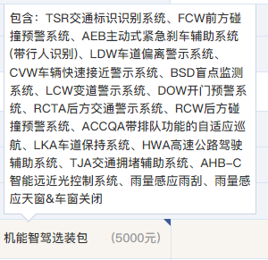 除此之外,两款车更多的区别是在一些可拓展的配置上。例如长续航版可以选装5个摄像头,而标准续航版只有4个且不能升级;126长续航Pro还可选装一系列的功能,比如全速自适应巡航、L2级别驾驶辅助、自适应远近光和感应雨刷,而这些配置,是需要5000元选装的。