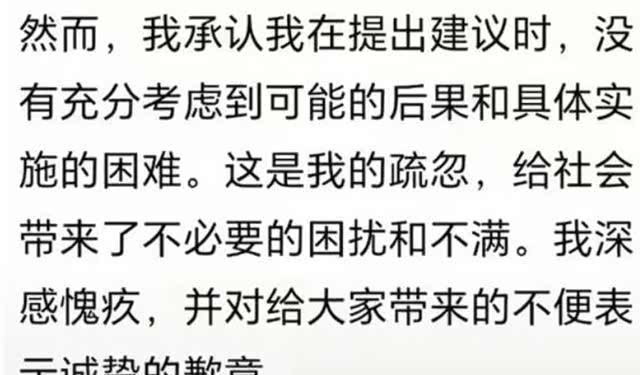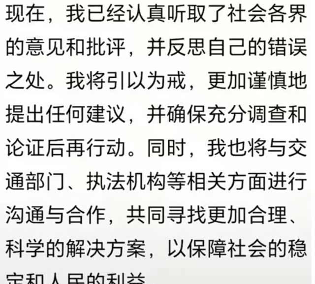 最近陈海仪也公开发表了道歉信,其表示,提出建议的初衷也是为了维护社会交通秩序,降低交通事故发生的概率,更大程度的保障人民的生命财产安全。但是,在实际建议考虑的过程中,没有充分考虑到实施过程的困难,和老百姓实际的出行状态,执行这样的处罚措施给老百姓带来的生活影响大大超出了预期。对此给社会造成的种种不良影响以及给百姓的生活带来的巨大困扰,也表示了深刻的反思。