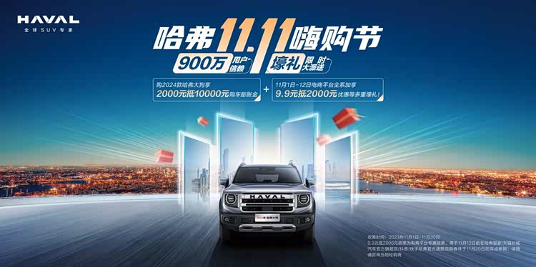 双十一大促期间,2024款哈弗大狗推出了限时限量的“王炸”购车优惠活动,错过要再等一年!只要在官方电商平台下单可享9.9元抵2000元电商专享补贴之外,现在购买2024款哈弗大狗,还可享六重好礼,比如购车膨胀金:购车可享2000元抵 10000元购车膨胀金;减压金融礼:1.5T:至高可享7万24期0息,2.0T:至高可享9万24期0息。