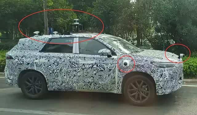 先来看看前端,遮挡比较严重,只能看到个大概,上图红圈内能够看到前机舱盖前端安置了一个临时加装的底座,上面是固态激光雷达,位置与星途揽月上的接近,不出意外只能这位置安装了,下端似乎还有一个附加的矩形框出现,可能是侧向的毫米波雷达位置,由于角度受限,自然是猜测性质的。