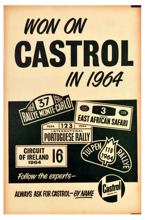 图:嘉实多在1964年的广告,这则广告上面贴出了曾经在当年赢得的赛事,例如蒙地卡洛、葡萄牙拉力赛、爱尔兰场地赛、东非拉力赛和郁金香拉力赛(荷兰)等等。