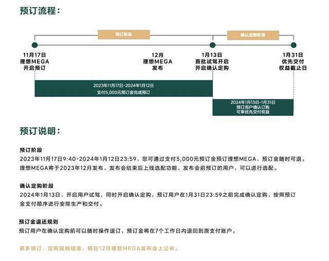 理想MEGA的订金为5000元(随时可退,7个工作日内退还至原支付账户),车辆的预订阶段为2023年11月17日-2024年1月12日。在明年1月13日以后,理想MEGA开启首批试驾,同时进入确认订购阶段,在1月31日前确认订购的用户可享受优先交付权益。