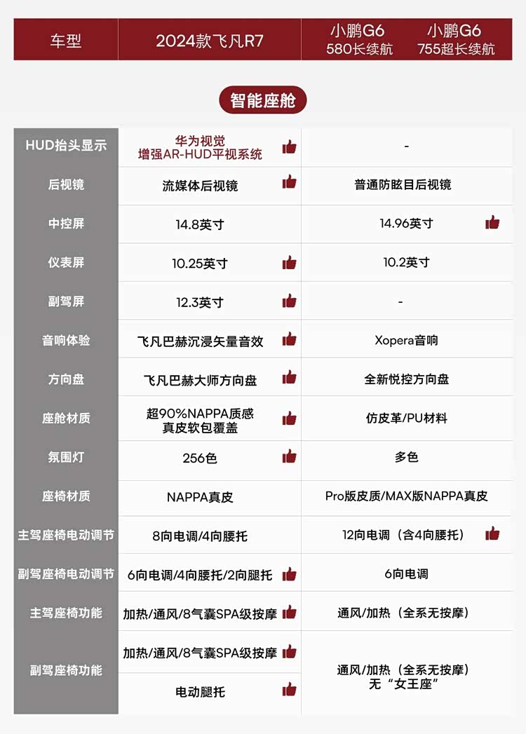 另外,在用户比较关注的豪华配置方面,新款飞凡R7不仅有256色氛围灯和NAPPA真皮座椅,前排座椅加热/通风/按摩全套功能也能让舒适性提升一档;另外,副驾电动腿托的设计也非常符合目前最流行的女王座趋势。小鹏G6在用料和功能上则要略逊一些。
