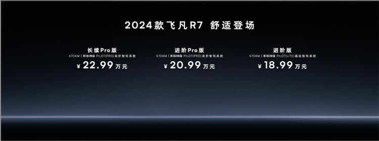 在这种降低价格,提升产品力百试百灵的方法下,一直不温不火的飞凡也坐不住了。今天,定位于中大型轿跑SUV的2024款飞凡R7正式上市,虽早有传言新车要降至21万区间,但实际看到直降9万元,把起售价打到18.99万元的做法后,很多人也被这个震撼的售价给惊到了。其甚至比中型车小鹏G6还要低2万元,这也导致两款车型将开始直面竞争。