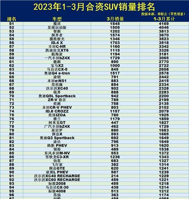 近日,2023年第一季度合资SUV销量排行榜终于姗姗来迟,此次共有138款车型入榜,不出意外,第一名仍是全球电动汽车老大特斯拉,同时,也是唯一一款销量超过九万台的车型,丰田汉兰达、本田皓影、沃尔沃XC60均一万出头,还有41款车型不足千台,冒险家PHEV垫底,仅为10台。