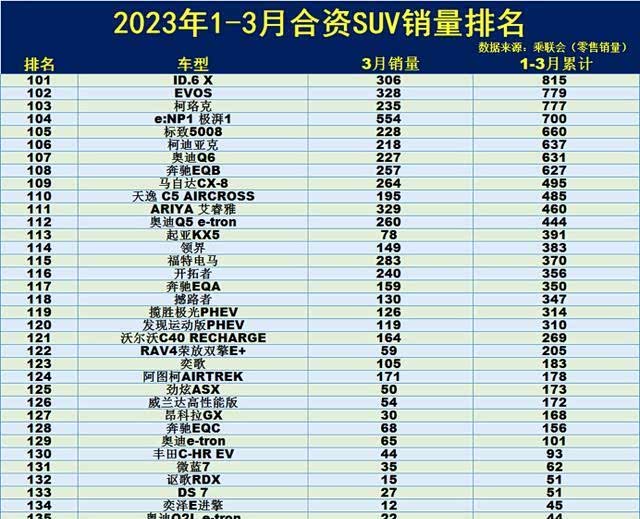 这一梯度的41款车型,3个月的总销量加起来都没有超过一千台的,可想而知处境有多艰难。比如奥迪Q6、LYRIO锐歌、标致5008、奔驰的EQA和EQB,还有雪佛兰的开拓者。