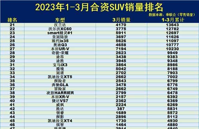 汉兰达、沃尔沃XC60、smart精灵#1、奥迪Q3一季度总销量一万出头,平均月销量在四千台左右。本田UR-V走势强劲,近半年单月销量首次突破两千台,3月份一路逆袭达到7194台,而2023年1、2月份分别只有1218台和1818台。
