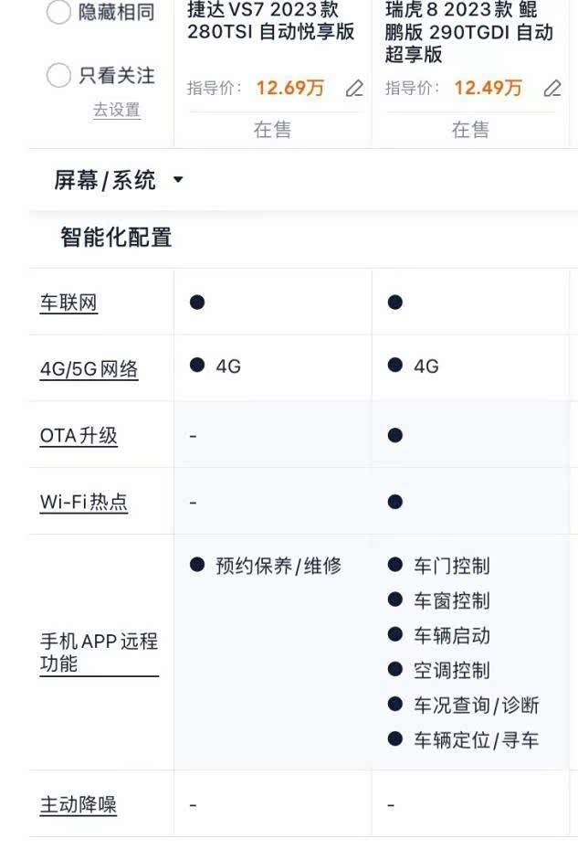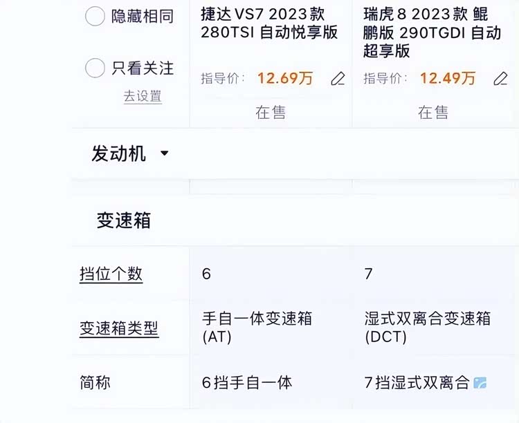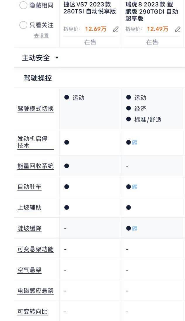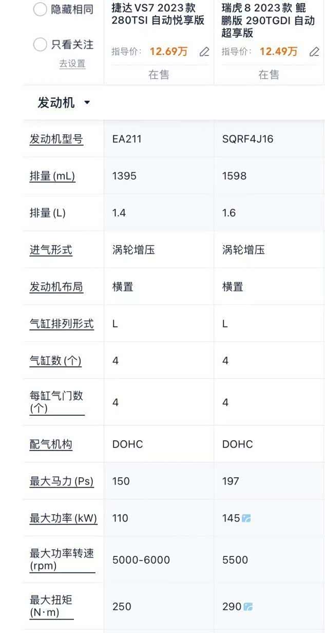 此处选择价格比较相近的捷达VS7 2023款 280TSL 自动悦享版,和瑞虎8 2023款 鲲鹏版 290TGDL 自动超享版,两款车的售价分别是12.69万、12.49万。