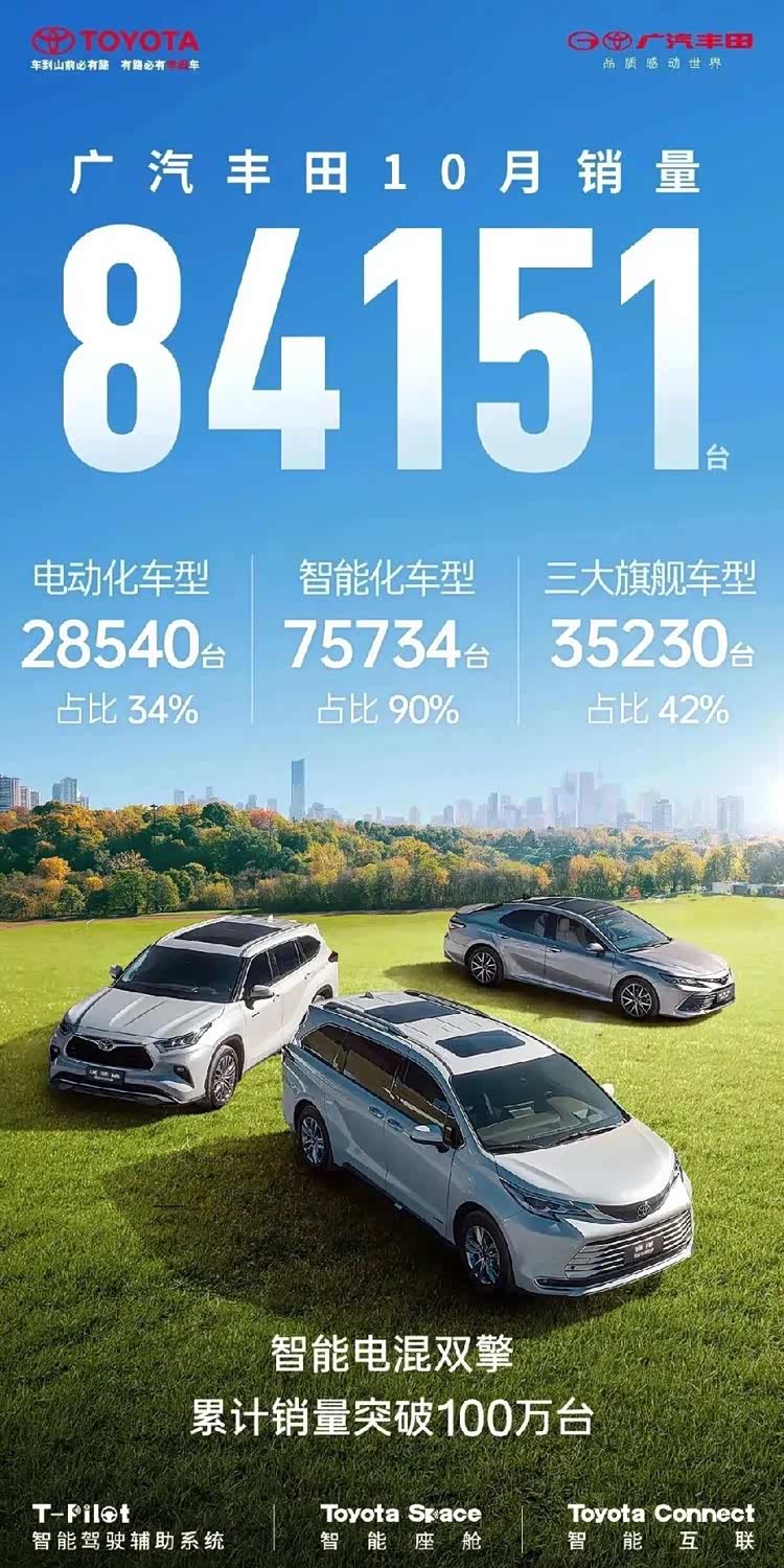 而这,也是广汽丰田走在市场前沿的核心原因。最新数据显示,广汽丰田1-10月累计销量达到748000台,当中电动化车型累计销量达到240462台,占比32%;智能化车型累计销量达到649213台,占比87%。同时,截至今年10月,广汽丰田智能电混双擎累计销量已突破百万台。