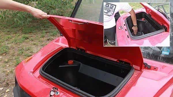 在车头前舱盖下还设计了一个51L的储藏空间,且设计有放水密封条和导水槽,具有极高实用性。这车最让人惊喜的就是它的货厢,长度达到1827mm,额定载重300kg,做到很多普通燃油皮卡都做不到的事情,你说6不6?另外在货厢的两侧还配备了铁钩,方便车主拉货、紧固货物。