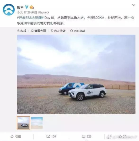 2018年的时候,蔚来曾经组织过一场ES8新疆行活动。事毕之后,蔚来官微专门发表了上面这则博文,并且配上了初代ES8与大通EV80电动补能车同框的照片。