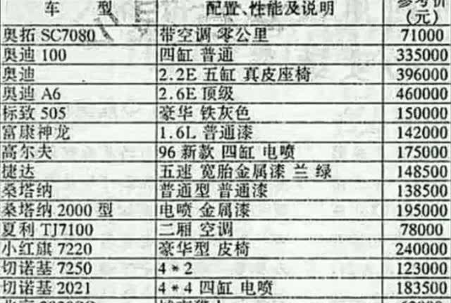 从表格上可以看出,现在许多热销车型,以前的报纸上也有,例如奥迪A6,高尔夫,捷达。但也有许多未曾谋面的车型,例如小红旗,富康神龙。当时的价格与现在相差并不大,就拿A6来说,现在的售价也在四五十万,所以说奥迪25年都没有变化,牢牢地坚守在价格岗位上。别看有些车型我们不熟悉,甚至觉得它有点土。但如果上个世纪末,能拥有一辆车就非常了不起了,开 桑塔纳(参数|询价)的比现在开奥迪的还要有钱。