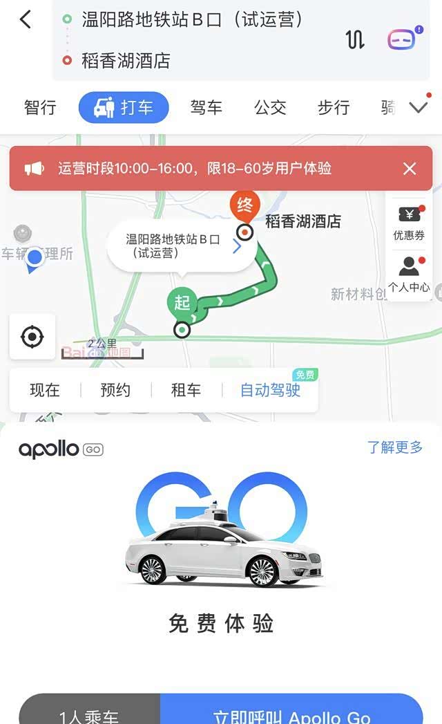 目前普通消费者想要体验百度自动驾驶出租车,主要有两个途径,第一就是通过百度地图内的“打车”选项,里面有“自动驾驶”,按照推荐(不能自己自由设定)选择好上车点和下车点即可呼叫自动驾驶出租车前来“接驾”。还要一种更简单的,下载ApolloGOAPP,里面没有任何多余功能,在主页选择起点和终点即可呼叫自动驾驶出租车。
