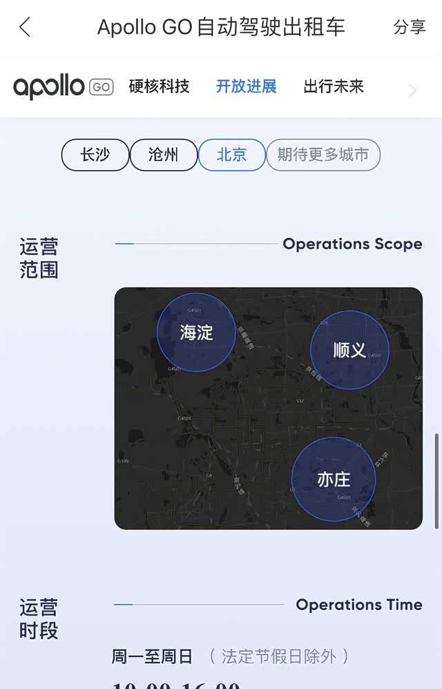 其实这项免费体验还是有一些硬性标准的,首先就是体验者年龄须在18-60周岁,其次就是每次最多只能2人同时乘坐。最后也是最大的遗憾,这项免费体验活动目前仅在北京、长沙、沧州三个城市进行。而且在北京也是分成了海淀、顺义、亦庄三个互相没有直接联系的体验区域。笔者是在北京海淀区进行的此次体验。