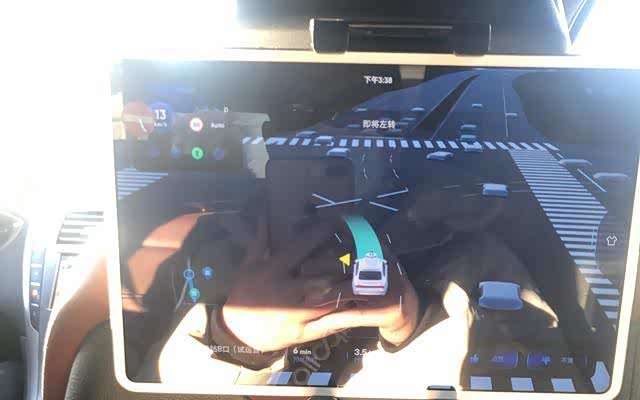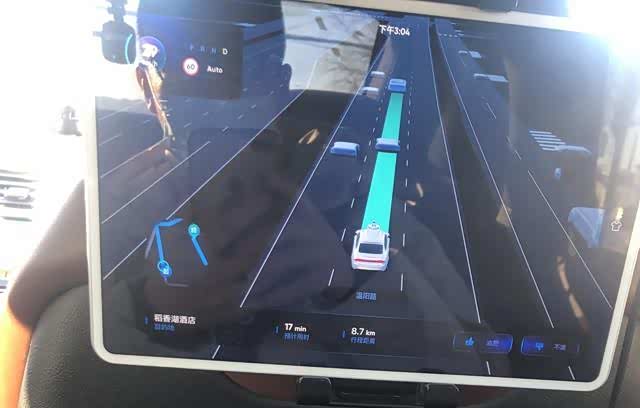 车辆行驶过程中最值得我们关注的就是眼前的这块儿大概10英寸大小的屏幕了。它的左上角显示的是车辆当前的档位和车速,中间显示车辆位置和实时路况信息,最下边显示的行程信息和“点赞”“不满”两个互动按键,可惜当时太激动忘了给它“点赞”。