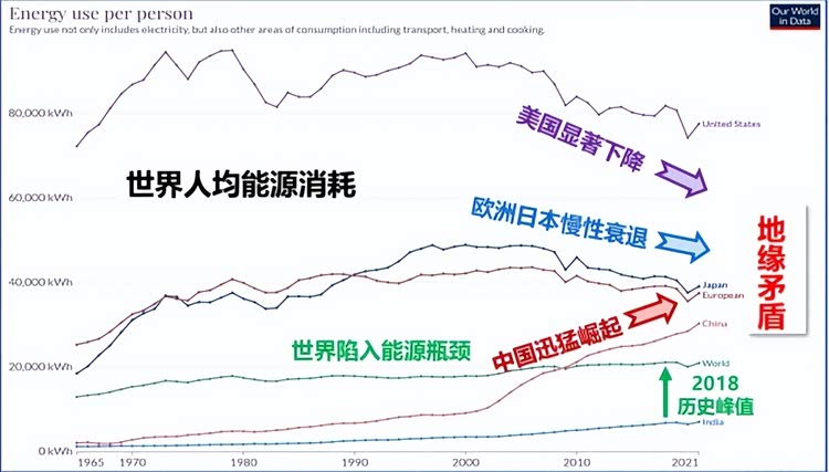举例来说,在过去的20年里,中国人均能源消费量迅猛崛起,而欧美日则不断下滑,与之对应的就是双方经济实力的此消彼长,地缘矛盾逐步酝酿。