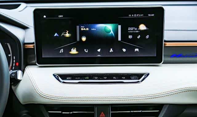 12.3寸液晶中控屏支持Wi-Fi智能投屏,可以和8.6寸全彩抬头显示以及液晶仪表盘实现三屏智慧联动,车机操作流畅,娱乐功能丰富。