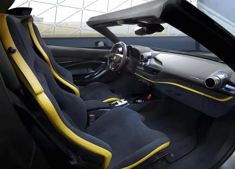 车内部份,法拉利针对 F8 Spider 的中控台进行调整,集成了法拉利现款新车型的变速箱控制界面。另外,座椅部份采用激光蚀刻的 Navy Blue Alcantara® 面料和渐变织物,构成了新车内饰的点睛之笔。
