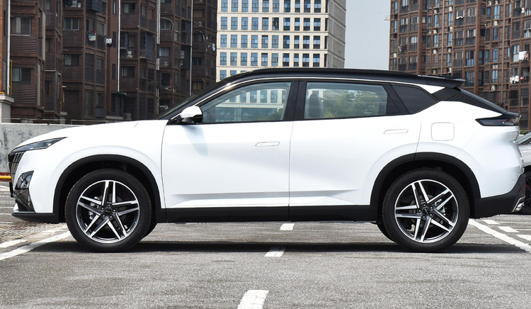 从侧面去看,双色车身紧跟潮流,上黑下白的设计不会过时,车顶是悬浮式设计,后半段有下压式的处理。车辆提供了隐藏式门把手,但仔细看去是前低后高设计,不在同一水平线上,轮眉位置有一定的凸起,让自己看上去更运动一些,五辐式轮毂融入了国风元素,尺寸方面更是达到了20英寸,当然低配版本车型尺寸会小一些。而作为一台紧凑型SUV,空间上面家用挺合理,从具体数据来看,长宽高在4650×1905×1630毫米,车身轴距在2775毫米。