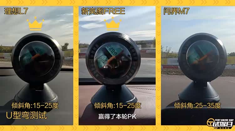 还有动态U型弯测试,该环节比起考验底盘极限工况和循迹性的麋鹿测试,更能看出一台车在过弯、调头时的灵活性,以及转向、操控精度、侧倾表现等。从成绩来看,三台车都以80km/h时速进入U型弯时,理想L7和岚图FREE都做到了15-25度侧倾角,问界M7则是25-35度侧倾角。