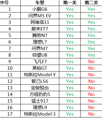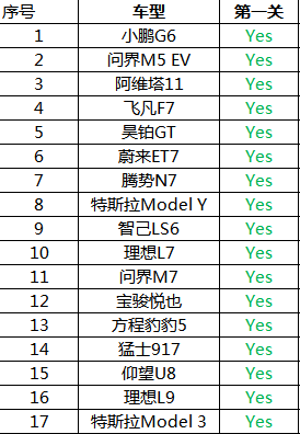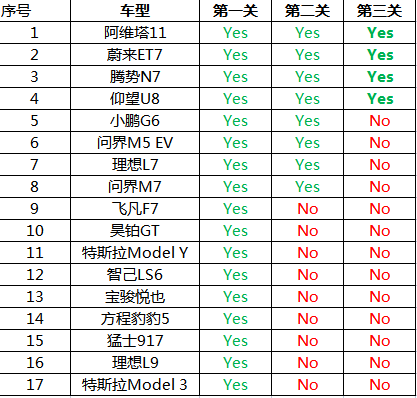 那么从最终结果看,51款车型中,仅有四款车型通过的全部的三项测试,他们分别是:阿维塔11、腾势N7、蔚来ET7、仰望U8。四款车型,一款来自于华为系,一款来自于新势力、两款来自于比亚迪。