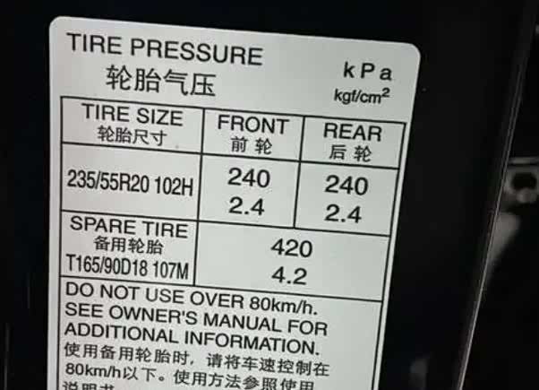 |高性能轿车|2.4-2.8bar|胎压过低会影响操控性和安全性。高速驾驶时可适当增加胎压。|