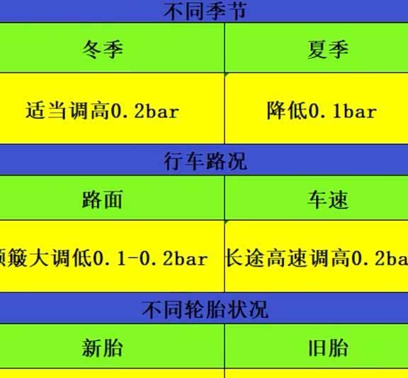 为了方便大家记忆和参考,我们提供一张胎压调整方法和原则的表格: