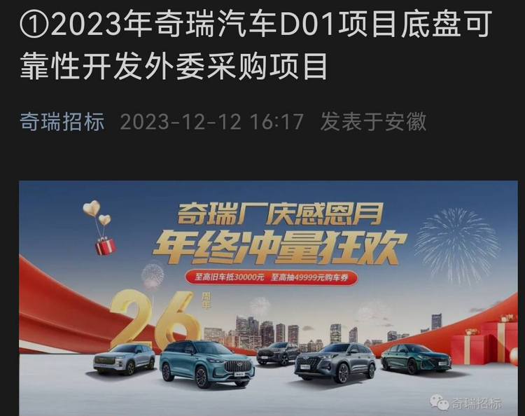 D01项目是首次出现,完全一头雾水之中,可以说没有任何的规律性可言,现在只能靠强制记忆了,记住这个编号,知道有一个D01项目即可,当然这是对于硬派SUV的消费群体而言的,以后别问奇瑞是否有此类车型的问题了,现在应该问何时能推向市场的问题了,当然那可以明确招标信息的公布,说明整车设计可能已经冻结,开始转向实质层面的整车开发了,也就是说要为路试车的组装做相应的前期准备工作了,当然离正式路试还有一段距离。