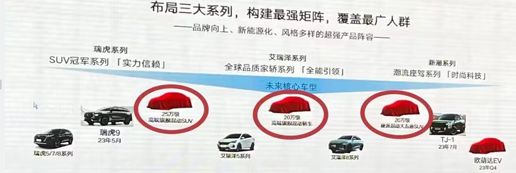 其实今年六月的时候,有人就曝光过一张图,里面就有奇瑞规划的三台全新车型,分别是25万级高端旗舰混动SUV、20万级高端旗舰混动轿车和20万级硬派混动大五座SUV这三个,前面两个现在都已揭晓了答案,正是风云T11和风云A9,风云T11身形超过五米,轴距超过3米,妥妥的旗舰车型的风范,至于风云A9没有公布参数信息,借助以前获得的信息,轴距大概也是2.9米的B级轿车范畴。
