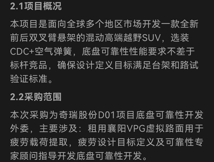 为何说更高端一些?起码这招标信息里提及到了空气悬架+CDC的字眼,捷途目前知道的是只有T-3项目才有相应的规划,而且仔细对比的话,就能发现,捷途T-3也是前后双叉臂+空气悬架+CDC的组合方案,唯一不同的是捷途T-3走的是增程路线,而奇瑞的D01则是插电混动版的技术路线,当然这也从侧面说明,该车用的是第五代的2.0TGDI混动专用发动机+3DHT165B型混动专用变速器的搭配方案。