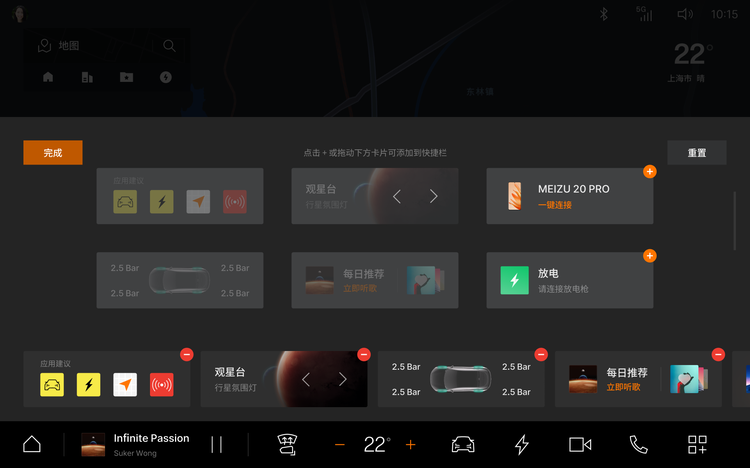 Polestar OS中的快捷卡片功能不仅可定制,用户还可以根据个人喜好自定义Dock、快捷中心、应用列表等界面元素。通过简单的拖拽操作,用户可以根据不同场景构建自己理想的交互方案,满足各种需求。